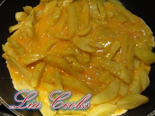 Πλένουμε ,καθαρίζουμε και κόβουμε τις πατάτες σε μπαστουνάκια.Τις τηγανίζουμε σε ελαιόλαδο και τις βγάζουμε σε ένα πιάτο.Αφαιρούμε από το τηγάνι το περιττό λάδι και ξαναρίχνουμε μέσα τις πατάτες.Χτυπάμε σε ένα πιάτο τα αυγά και περιχύνουμε στις πατάτες.Αλατοπιπερώνουμε.Σε αυτό το σημείο βάζουμε αν θέλουμε φέτα ή κασέρι σε κύβους και ζαμπόν.Ψήνουμε την ομελέτα από τη μια μεριά και γυρνάμε προσεκτικά και από την άλλη.
